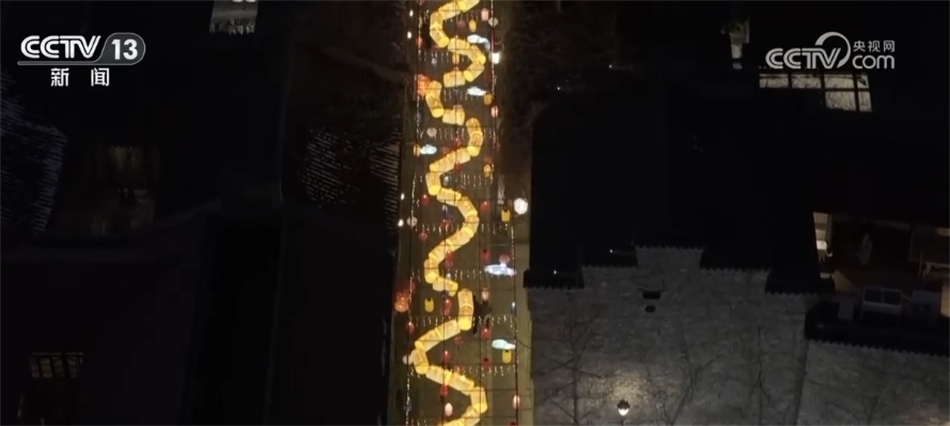 在老門東景區(qū),從空中俯瞰,一條長(zhǎng)130多米的龍燈貫穿在巷子里,蜿蜒盤旋點(diǎn)亮了城市夜空。
