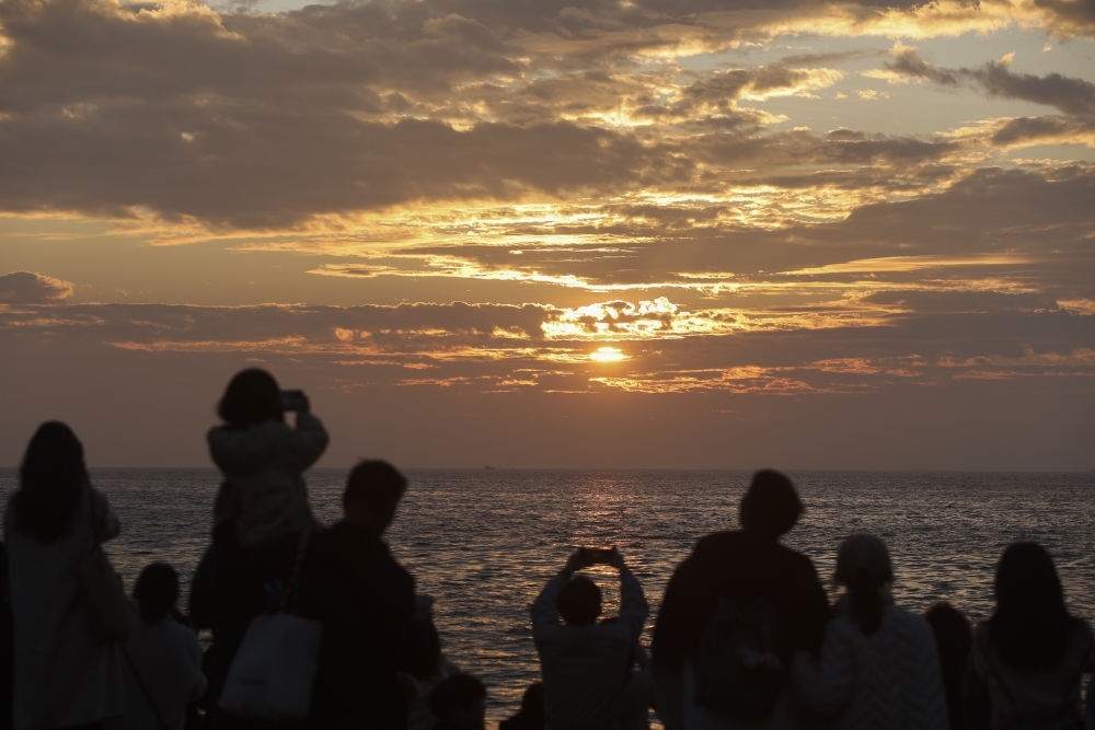 1月1日,人們?cè)谏綎|日照舉行的一場(chǎng)元旦迎日祈福儀式上觀看日出。新華社發(fā)(劉濤 攝)