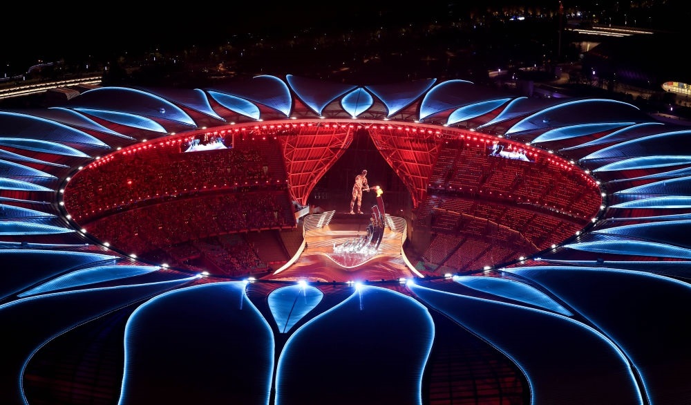 2023年9月23日,最后一棒火炬手汪順和數(shù)字火炬手在杭州亞運(yùn)會(huì)開(kāi)幕式上點(diǎn)燃主火炬。新華社記者 程婷婷 攝