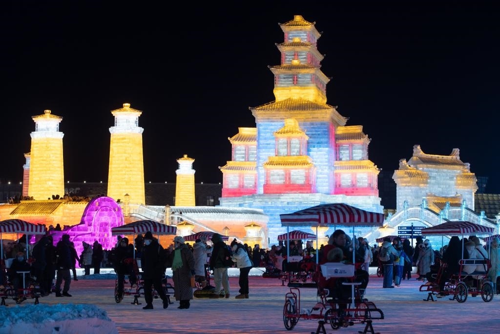 2023年12月31日,游客在哈爾濱冰雪大世界園區(qū)游玩。新華社記者 張濤 攝