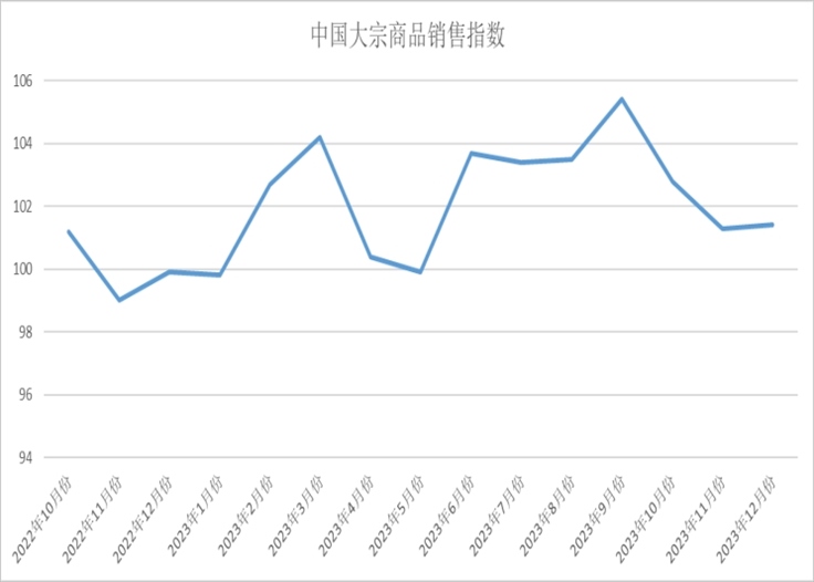 2023年12月份,大宗商品銷(xiāo)售指數(shù)小幅回升0.1個(gè)百分點(diǎn),至101.4%,顯示企業(yè)的冬儲(chǔ)行為及節(jié)前消費(fèi)端備貨為大宗市場(chǎng)需求端提供支撐,銷(xiāo)售指數(shù)上漲,但受制于大宗市場(chǎng)行情低迷,企業(yè)冬儲(chǔ)的熱情不及往年,且加之部分地區(qū)疫情反復(fù),持續(xù)降雪,又進(jìn)一步影響了市場(chǎng)需求,終端企業(yè)采購(gòu)越發(fā)趨于謹(jǐn)慎,本月銷(xiāo)售指數(shù)增速僅表現(xiàn)為小幅回升。各主要商品中,鐵礦石、原煤、有色金屬和汽車(chē)銷(xiāo)售量繼續(xù)增加,增速繼續(xù)加快;化工銷(xiāo)售量均有所增加,但前期石化產(chǎn)品價(jià)格上漲主要在于成本和供給層面的驅(qū)動(dòng),隨著驅(qū)動(dòng)力的邊際弱化,以及價(jià)格上漲之后的傳導(dǎo)逐步出現(xiàn)阻力,后期價(jià)格上漲恐難持續(xù),故銷(xiāo)售增速有所減緩;鋼鐵方面,12月是鋼鐵行業(yè)的傳統(tǒng)淡季,今年大范圍暴雪寒潮天氣使得多地氣溫驟降,也加快了鋼市需求衰減的步伐,整體需求進(jìn)入了季節(jié)性衰退期,市場(chǎng)銷(xiāo)售量出現(xiàn)下降;成品油方面,進(jìn)入12月,需求依舊平淡,且出口量受阻,對(duì)煉廠開(kāi)工仍有制約,導(dǎo)致成品油銷(xiāo)售量下降。