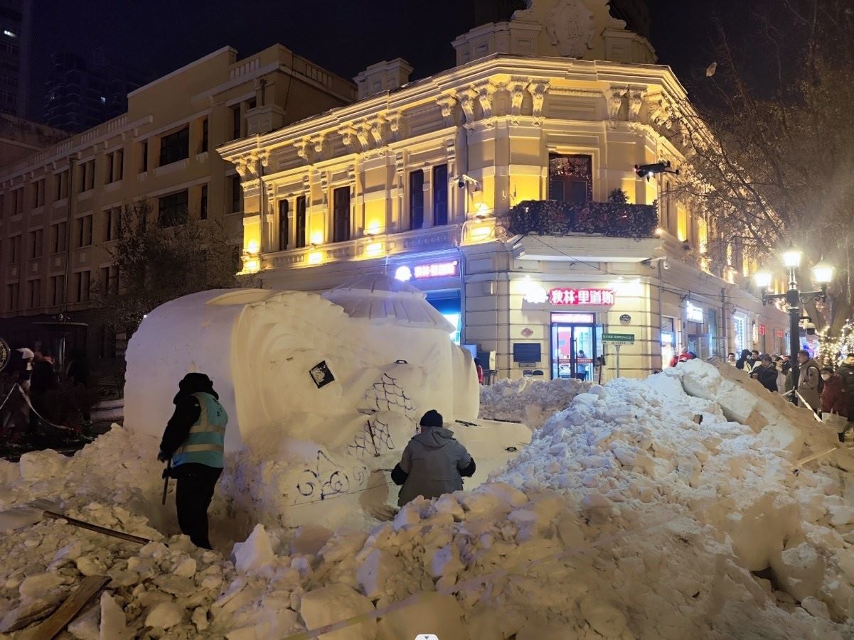 中央大街上,一間房大小的雪坯子到三米高的“五谷豐登”雪雕,從早上7點(diǎn)多一直到晚上9點(diǎn)多終于完工,包括臧洪洲在內(nèi)的三位雕刻師傅忙活了十多個(gè)小時(shí),除了午飯幾乎沒(méi)有休息,“比較細(xì)碎的雪渣,用鐵鍬清理不方便,就直接用手套和套袖一摟,一天下來(lái),手套全濕了。”