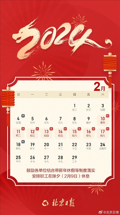 ·北京正式發(fā)布春節(jié)放假安排,鼓勵(lì)各單位結(jié)合年假等安排除夕休息。