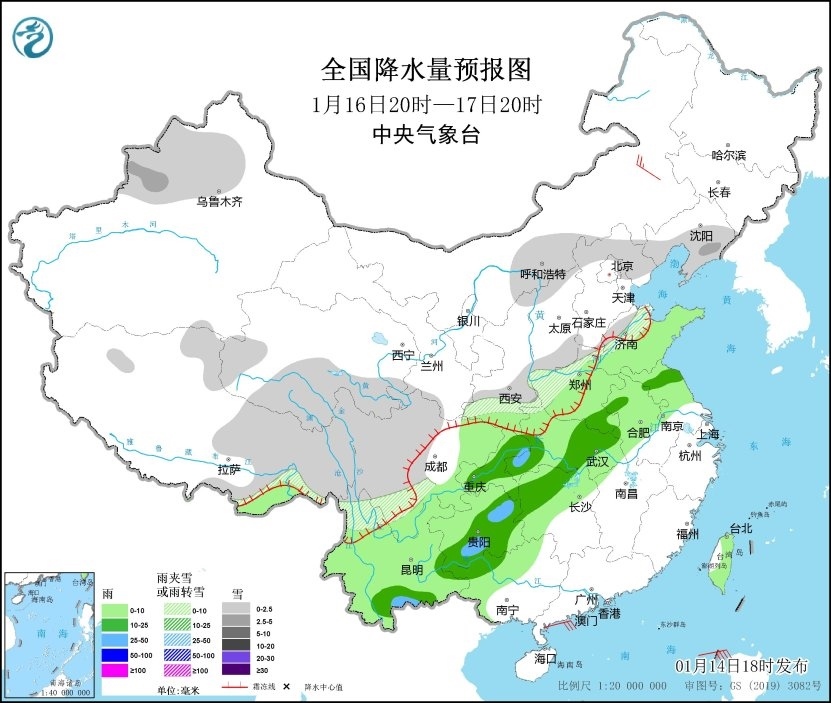 1月16日20時(shí)至17日20時(shí),新疆西部、青海南部、西藏東部、內(nèi)蒙古中部、遼寧中南部、河北北部、川西高原、陜西南部、山西南部、河南西北部、山東西北部、云南西北部等地的部分地區(qū)有小到中雪或雨夾雪;黃淮大部、江淮大部、江漢、江南西部、四川東部、重慶、貴州、云南、廣西西部、臺(tái)灣島等地的部分地區(qū)有小到中雨,其中湖北西南部、貴州中部和東北部、云南南部等地的部分地區(qū)有大雨。內(nèi)蒙古東南部等地的部分地區(qū)有4~5級風(fēng)(見圖3)。