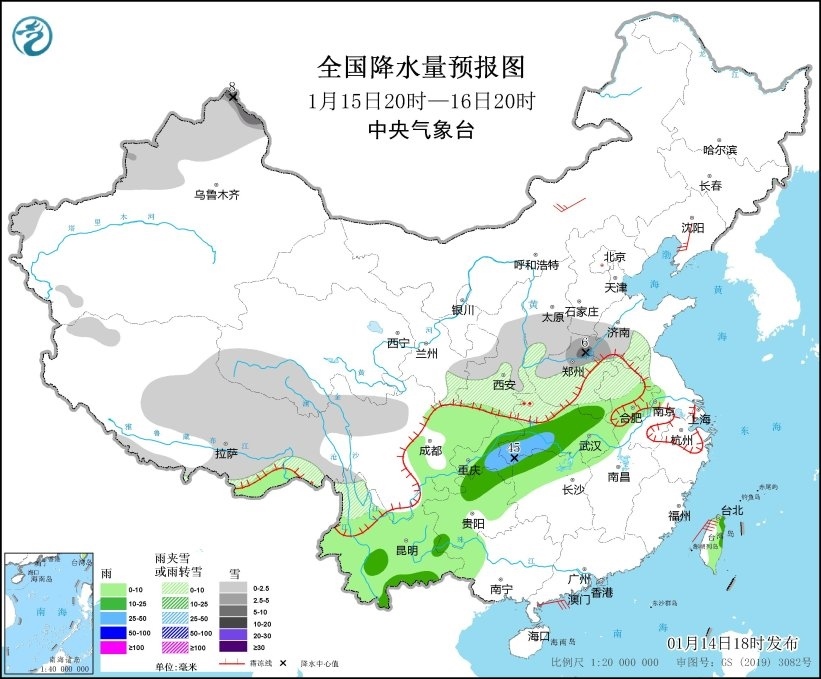 1月14日20時(shí)至15日20時(shí),新疆北疆西北部、西藏東部、甘肅東部、陜西、山西南部、河南等地的部分地區(qū)有小到中雪,其中新疆阿勒泰、陜西南部、河南西部等地的部分地區(qū)有大雪,局地暴雪(10~12毫米),陜西南部、湖北西北部局地有凍雨;西南地區(qū)東部、江漢中西部、江南西部和東北部、廣西西部和北部、云南南部、海南島等地有小到中雨,其中重慶中北部等地局地有大雨(25~35毫米)。山東半島、江南東北部、西藏等地的部分地區(qū)有4~6級風(fēng),其中浙江東部沿海、西藏中部的部分地區(qū)風(fēng)力可達(dá)7級以上(見圖1);臺(tái)灣海峽有7~8級、陣風(fēng)9級的東北風(fēng),黃海、東海大部、南海中北部和西南部有5~7級風(fēng),陣風(fēng)8級。