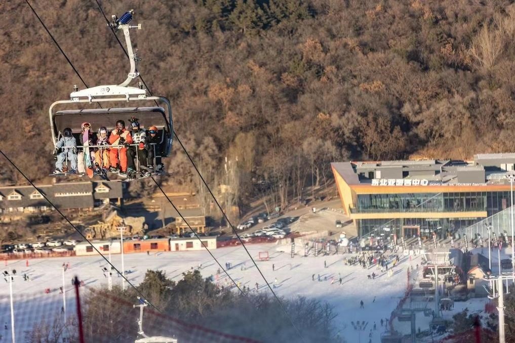 圖為游客在東北亞國(guó)際滑雪場(chǎng)乘坐纜車(chē)。