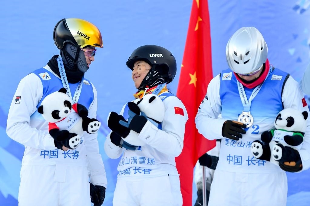 12月17日,獲得亞軍的中國(guó)二隊(duì)選手陳梅婷(中)、王心迪(右)和李天馬在頒獎(jiǎng)儀式上。當(dāng)日,2023-2024賽季國(guó)際雪聯(lián)自由式滑雪空中技巧世界杯(中國(guó)長(zhǎng)春分站賽)男女混合團(tuán)體決賽在吉林長(zhǎng)春蓮花山滑雪場(chǎng)舉行。新華社記者 許暢 攝