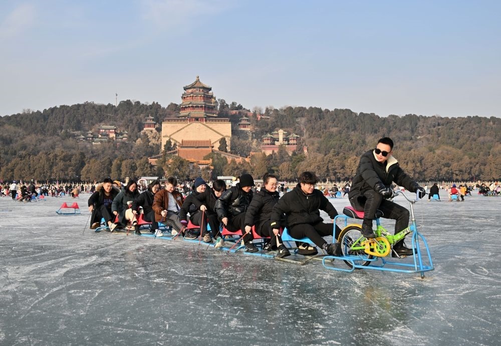 2024年1月1日,游客在北京頤和園冰場玩冰車和冰上自行車。新華社記者 陳曄華 攝