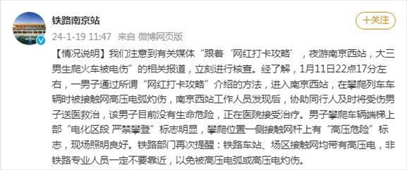 ·南京站回應(yīng)“大學(xué)生爬火車(chē)打卡被燒傷進(jìn)ICU”:男子無(wú)生命危險(xiǎn),接觸網(wǎng)均有高壓電非專(zhuān)業(yè)人員不要靠近。