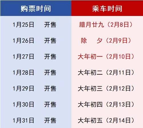1月26日,2024年2月9日的除夕火車票將正式發(fā)售。2024年春運自1月26日開始至3月5日結(jié)束,共40天。2024年春節(jié)假期從2月10日(初一)至2月17日(正月初八),共8天。根據(jù)目前鐵路客票提前15天預(yù)售的規(guī)則類推,1月27日開售2月10日(大年初一)火車票;2月3日開售2月17日(正月初八)火車票。