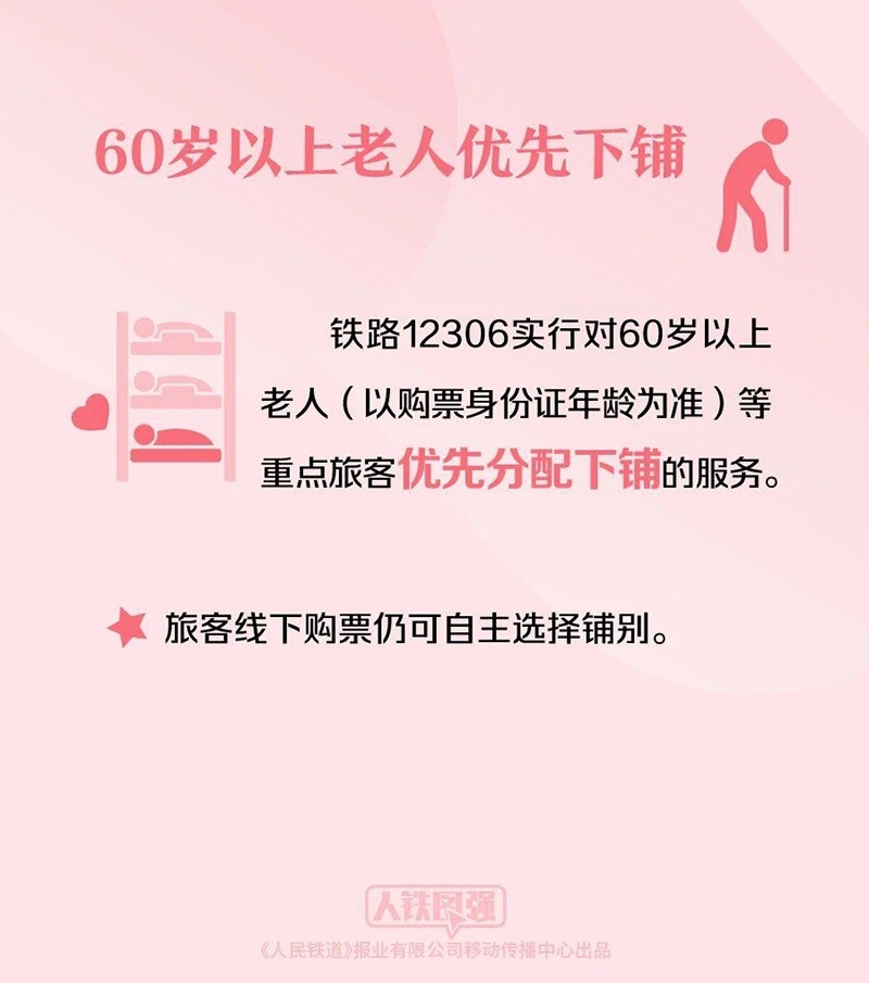 在票量充足的情況下,系統(tǒng)自動識別60歲以上的老年旅客并優(yōu)先安排下鋪。如果是多人同行一份訂單,系統(tǒng)也會自動分配相鄰鋪位。