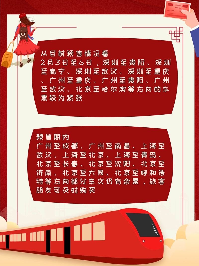 從目前預售情況看,2月3日至6日,深圳至貴陽、深圳至南寧、深圳至武漢、深圳至重慶、廣州至重慶、廣州至貴陽、廣州至武漢、北京至哈爾濱等方向的車票較為緊張。預售期內,廣州至成都、廣州至南昌、上海至武漢、上海至北京、上海至青島、北京至長春、北京至沈陽、北京至濟南、北京至大同、北京至呼和浩特等方向部分車次仍有余票,旅客朋友可及時購買。