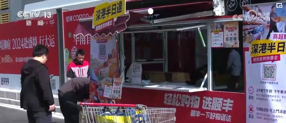 在深圳的這家超市,從出口處向外走兩步,就是快遞公司專門在現(xiàn)場(chǎng)設(shè)置的寄送服務(wù)點(diǎn)。大包、小包的商品從剛剛推出的購物車?yán)锉魂懤m(xù)裝進(jìn)打包箱,即發(fā)即走。港澳消費(fèi)者大概前腳剛到家,后腳就能收到貨。
