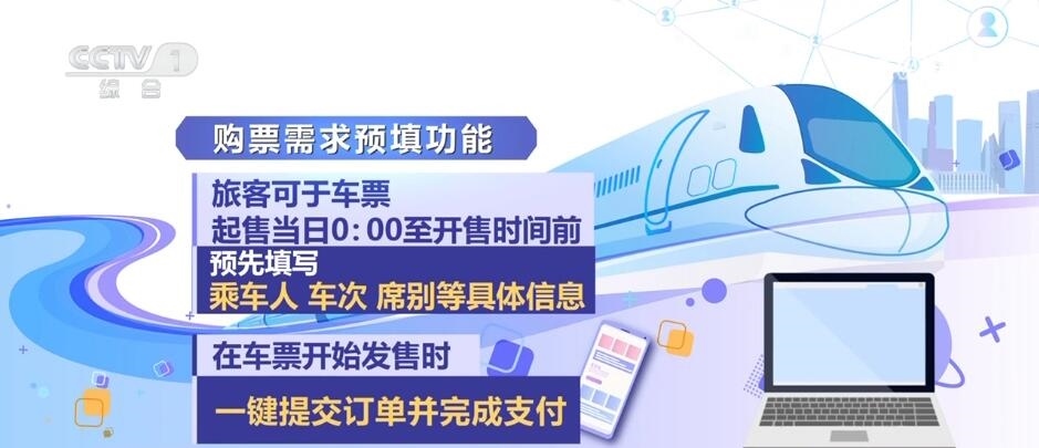 鐵路部門今年還增加了購票需求預(yù)填功能,旅客可于車票起售當(dāng)日0:00至開售時間前,預(yù)先填寫乘車人、車次、席別等具體信息,在車票開始發(fā)售時一鍵提交訂單并完成支付。