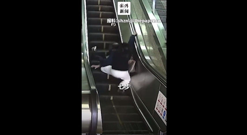 ·江蘇南京地鐵站內(nèi)一老人在乘坐扶梯時突然失去平衡,向后倒去,身后女子用七步護住老人。