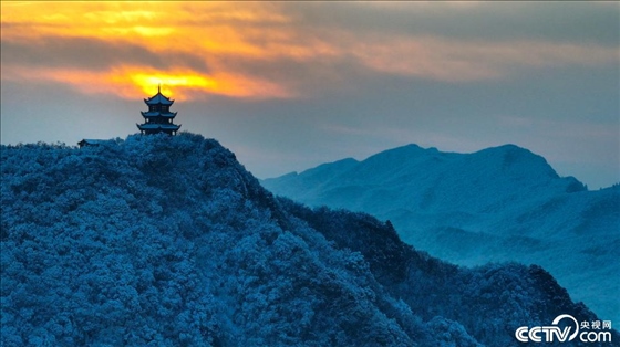 1月27日,陜西漢中,龍頭山雪后山林白雪皚皚,朝霞暈染天際。