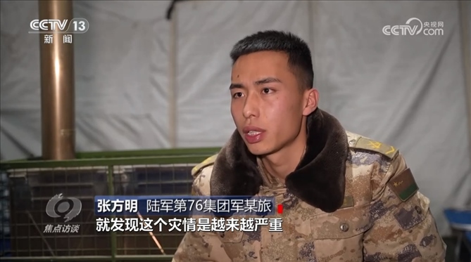 陸軍第76集團(tuán)軍某旅章新禹:“據(jù)我們了解,他家五間房屋全部開裂,家人在院子里面搭了一個帳篷,我們優(yōu)先讓他回去解決自己的事情,然后再返回部隊?!?/p>