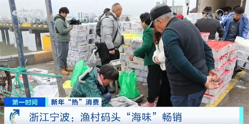 浙江寧波奉化區(qū)莼湖街道的漁村碼頭也進入了年前最后的繁忙時刻。上午八點,5艘運輸船停靠在內(nèi)外碼頭上,據(jù)了解,一艘運輸船有七八千箱漁獲物,近八成是帶魚。最近每天有百萬斤東海魚貨就地銷售或運往全國各地,預計將持續(xù)至臘月二十七。在碼頭邊桐照魚市場的攤位上,色澤鮮亮的帶魚、鯧魚、大黃魚等海產(chǎn)品琳瑯滿目,市民們忙著挑選,漁商們則賣力吆喝著。