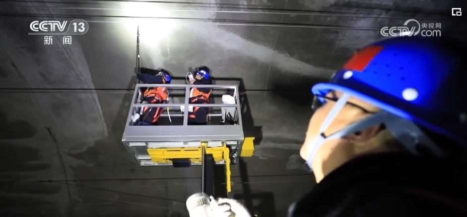 兩個8米高的作業(yè)平臺,10公斤重的敲擊桿,在與隧道壁的撞擊聲和作業(yè)車的風笛聲中,高鐵橋隧工們開始了工作。
