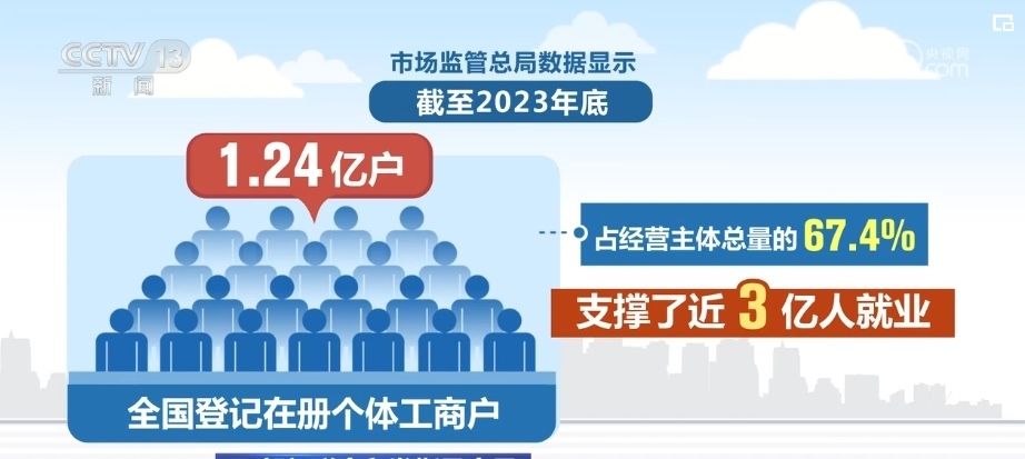 市場監(jiān)管總局?jǐn)?shù)據(jù)顯示,截至2023年底,全國登記在冊個(gè)體工商戶1.24億戶,占經(jīng)營主體總量的67.4%,支撐了近3億人就業(yè)。