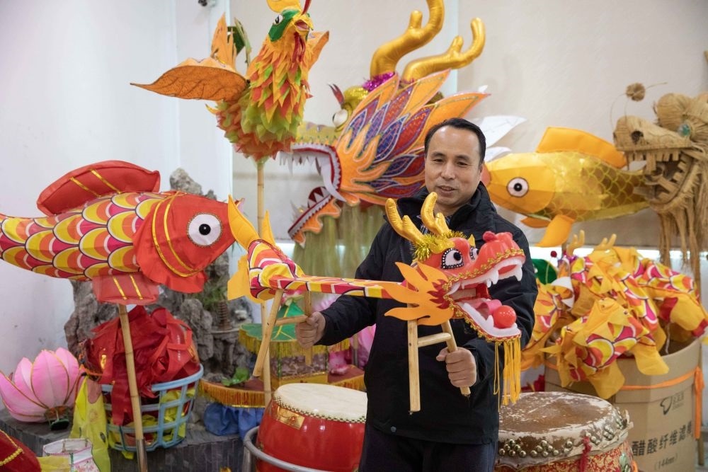 1月30日,南昌市青云譜區(qū)城南龍燈工廠,城南龍燈傳承人史克濱展示為兒童設(shè)計生產(chǎn)的小板凳龍。新華社發(fā)(孫睿澤 攝)