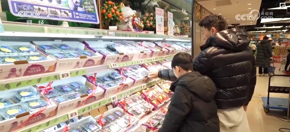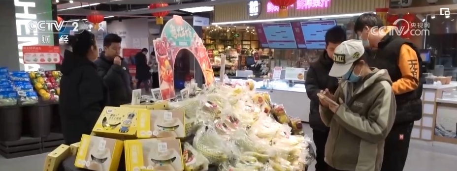除了蘋(píng)果,各類葡萄、柑橘、車?yán)遄印⒉葺?、藍(lán)莓、菠蘿、榴蓮等水果也大量上市。僅記者采訪的這家生鮮超市,新奇特品種相比2023年,就有5%—10%的增長(zhǎng),春節(jié)前更是有100多款水果在店內(nèi)銷售,豐富了百姓的“果盤(pán)子”。