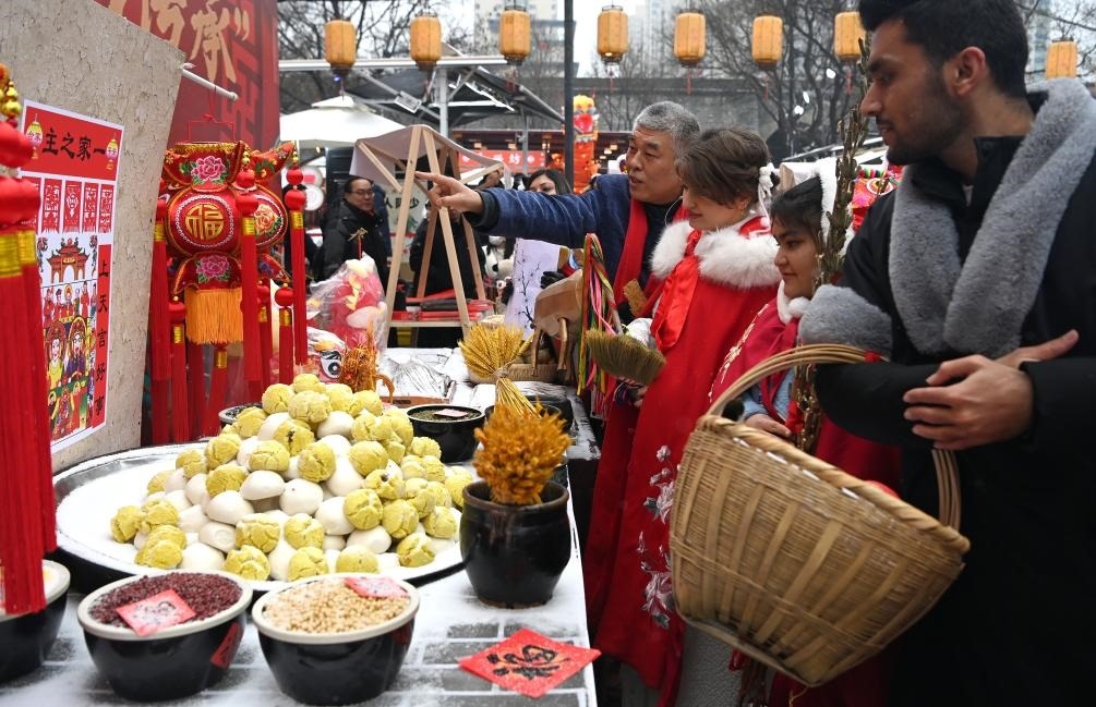 2月2日,在西安永興坊舉行的小年活動(dòng)上,來(lái)自西安各大學(xué)的留學(xué)生在民俗專(zhuān)家的講解下了解小年祭灶所用的物品。新華社記者 劉瀟 攝