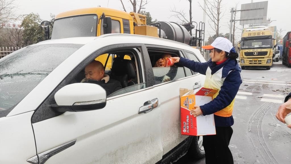 為讓滯留人員能吃上暖心飯,當(dāng)?shù)攸h委政府組織志愿者送來免費(fèi)的方便面、八寶粥、熱水等。