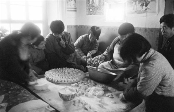 1985年,山東牟平一戶農(nóng)民全家一起包餃子。
