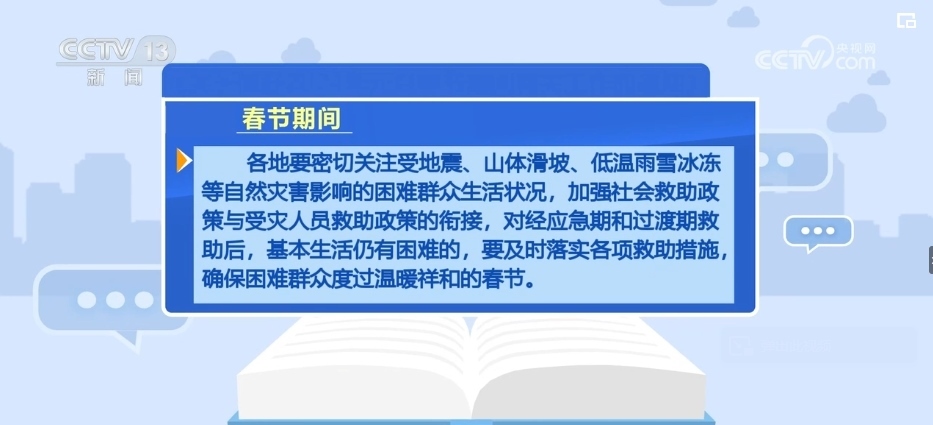 各地要密切關(guān)注受地震、山體滑坡、低溫雨雪冰凍等自然災害影響的困難群眾生活狀況,加強社會救助政策與受災人員救助政策的銜接,對經(jīng)應急期和過渡期救助后,基本生活仍有困難的,要及時落實各項救助措施,確保困難群眾度過溫暖祥和的春節(jié)。