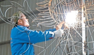 自貢龍騰文化藝術(shù)有限公司生產(chǎn)車(chē)間,焊花飛濺,一條中國(guó)龍的骨架正在成形。另一側(cè),裱糊工將龍鱗拼貼上色,彩燈漸顯神韻。