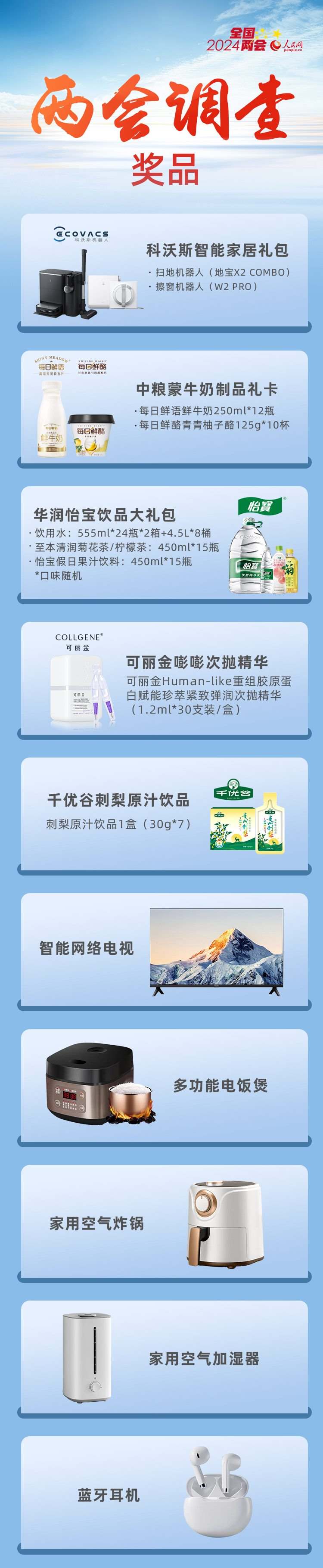 目前,調(diào)查還在火熱進行,各界可繼續(xù)通過人民網(wǎng)全媒體通道參與本次調(diào)查。為感謝網(wǎng)友對全國兩會調(diào)查的支持,參與者還有機會抽取精美獎品。