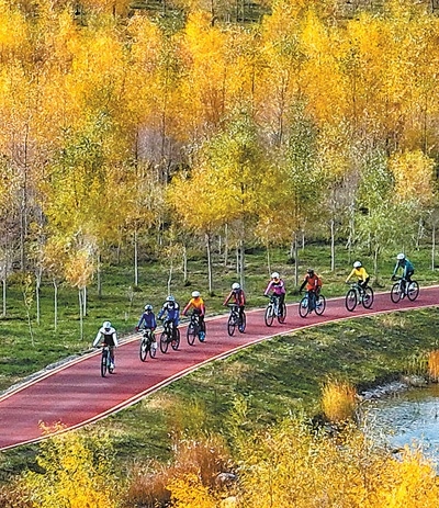 甘肅省張掖市奧林匹克森林公園,騎行愛好者們騎行穿過胡楊林。張掖市推進(jìn)綠化工程,亂石灘“變身”森林公園,成了市民健身休閑的理想之所。王 將攝(影像中國(guó))