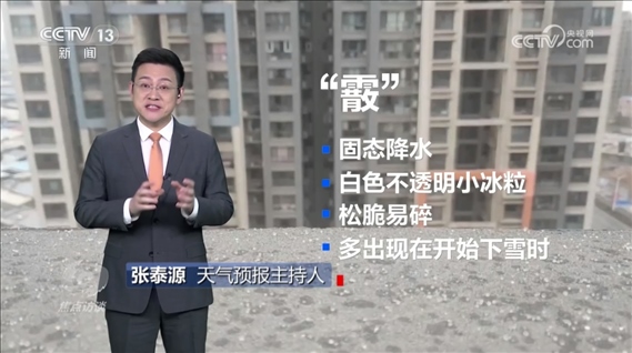 天氣預(yù)報(bào)主持人張?zhí)┰矗骸啊薄且环N固態(tài)降水,由白色不透明的小冰粒組成,近似球形,有時(shí)呈圓錐形,有雪狀結(jié)構(gòu),通常在地面氣溫不太冷時(shí)降落,在剛開始下雪的時(shí)候出現(xiàn)?!?/p>