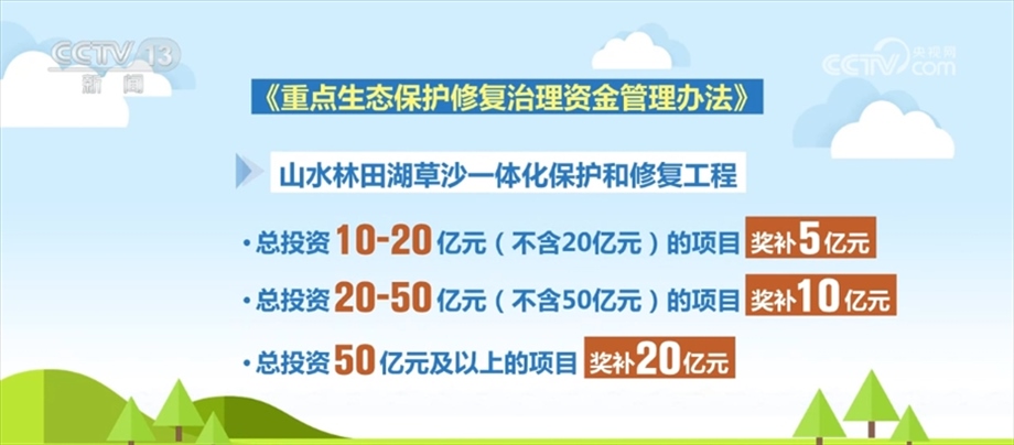 資金具體怎么分配?新辦法指出,山水林田湖草沙一體化保護和修復(fù)工程總投資10億元—20億元(不含20億元)的項目獎補5億元;工程總投資20億元—50億元(不含50億元)的項目獎補10億元;工程總投資50億元及以上的項目獎補20億元。歷史遺留廢棄工礦土地整治總投資5億元及以上的項目獎補3億元。