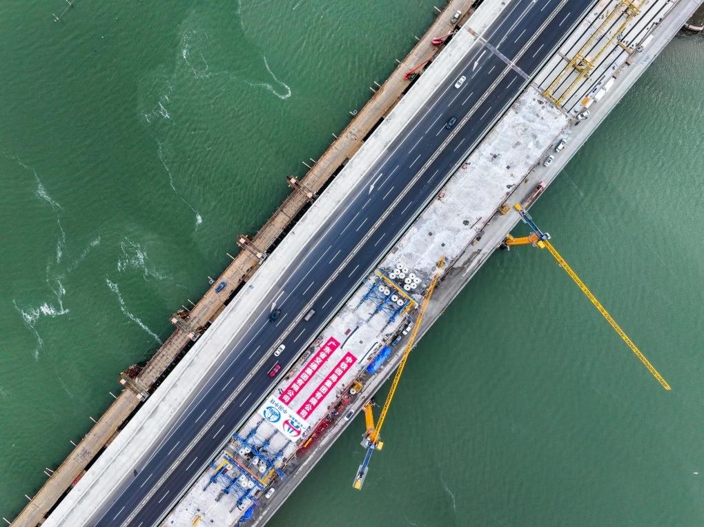 這是1月21日拍攝的深汕西高速長沙灣跨海特大橋(無人機照片)。當(dāng)日,中鐵四局承建的深汕西高速改擴建項目長沙灣跨海特大橋左幅主跨合龍。新華社記者 劉大偉 攝