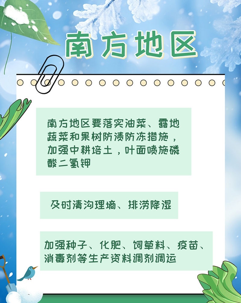 南方地區(qū)要落實油菜、露地蔬菜和果樹防漬防凍措施,加強中耕培土,葉面噴施磷酸二氫鉀;及時清溝理墑、排澇降濕。加強種子、化肥、飼草料、疫苗、消毒劑等生產(chǎn)資料調(diào)劑調(diào)運。