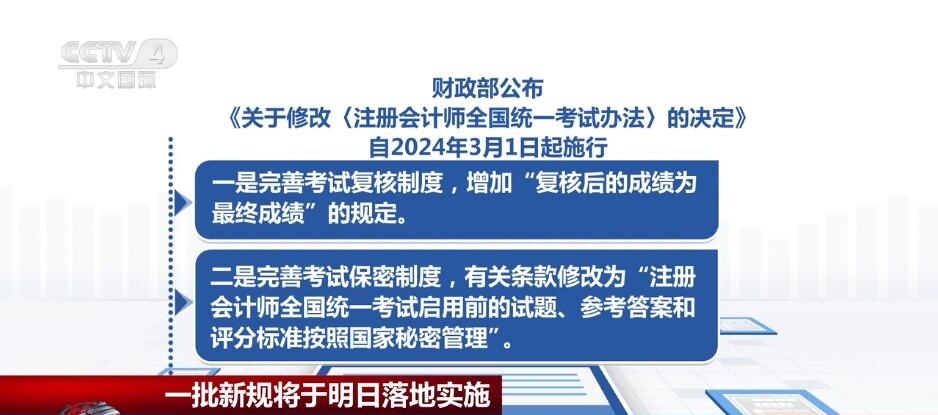 財政部公布《關(guān)于修改〈注冊會計師全國統(tǒng)一考試辦法〉的決定》,自2024年3月1日起施行?!稕Q定》共修改2條。一是完善考試復(fù)核制度,增加“復(fù)核后的成績?yōu)樽罱K成績”的規(guī)定。二是完善考試保密制度,有關(guān)條款修改為“注冊會計師全國統(tǒng)一考試啟用前的試題、參考答案和評分標(biāo)準(zhǔn)按照國家秘密管理”。