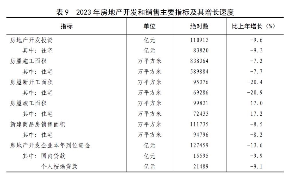 全年房地產(chǎn)開(kāi)發(fā)投資110913億元,比上年下降[43]9.6%。其中住宅投資83820億元,下降9.3%;辦公樓投資4531億元,下降9.4%;商業(yè)營(yíng)業(yè)用房投資8055億元,下降16.9%。全年新建商品房銷(xiāo)售面積[44]111735萬(wàn)平方米。二手房交易網(wǎng)簽面積[45]70882萬(wàn)平方米。年末新建商品房待售面積67295萬(wàn)平方米,其中商品住宅待售面積33119萬(wàn)平方米。