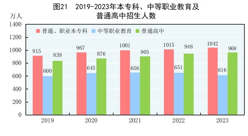 全年研究生教育招生130.2萬(wàn)人,在學(xué)研究生388.3萬(wàn)人,畢業(yè)生101.5萬(wàn)人。普通、職業(yè)本專(zhuān)科[70]招生1042.2萬(wàn)人,在校生3775.0萬(wàn)人,畢業(yè)生1047.0萬(wàn)人。中等職業(yè)教育[71]招生616.5萬(wàn)人,在校生1737.9萬(wàn)人,畢業(yè)生537.1萬(wàn)人。普通高中招生967.8萬(wàn)人,在校生2803.6萬(wàn)人,畢業(yè)生860.4萬(wàn)人。初中招生1754.6萬(wàn)人,在校生5243.7萬(wàn)人,畢業(yè)生1623.6萬(wàn)人。普通小學(xué)招生1877.9萬(wàn)人,在校生10836.0萬(wàn)人,畢業(yè)生1763.5萬(wàn)人。特殊教育招生15.5萬(wàn)人,在校生91.2萬(wàn)人,畢業(yè)生17.3萬(wàn)人。學(xué)前教育在園幼兒4093.0萬(wàn)人。九年義務(wù)教育鞏固率為95.7%,高中階段毛入學(xué)率為91.8%。