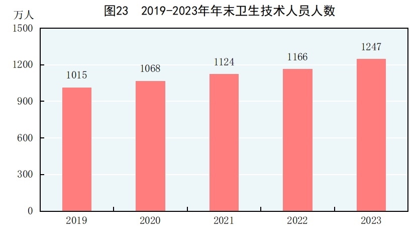 年末全國(guó)共有醫(yī)療衛(wèi)生機(jī)構(gòu)107.1萬(wàn)個(gè),其中醫(yī)院3.9萬(wàn)個(gè),在醫(yī)院中有公立醫(yī)院1.2萬(wàn)個(gè),民營(yíng)醫(yī)院2.7萬(wàn)個(gè);基層醫(yī)療衛(wèi)生機(jī)構(gòu)101.6萬(wàn)個(gè),其中鄉(xiāng)鎮(zhèn)衛(wèi)生院3.4萬(wàn)個(gè),社區(qū)衛(wèi)生服務(wù)中心(站)3.7萬(wàn)個(gè),門(mén)診部(所)36.2萬(wàn)個(gè),村衛(wèi)生室58.3萬(wàn)個(gè);專(zhuān)業(yè)公共衛(wèi)生機(jī)構(gòu)1.2萬(wàn)個(gè),其中疾病預(yù)防控制中心3426個(gè),衛(wèi)生監(jiān)督所(中心)2791個(gè)。衛(wèi)生技術(shù)人員1247萬(wàn)人,其中執(zhí)業(yè)醫(yī)師和執(zhí)業(yè)助理醫(yī)師478萬(wàn)人,注冊(cè)護(hù)士563萬(wàn)人。醫(yī)療衛(wèi)生機(jī)構(gòu)床位1020萬(wàn)張,其中醫(yī)院800萬(wàn)張,鄉(xiāng)鎮(zhèn)衛(wèi)生院151萬(wàn)張。全年總診療人次[75]95.6億人次,出院人次[76]3.0億人次。