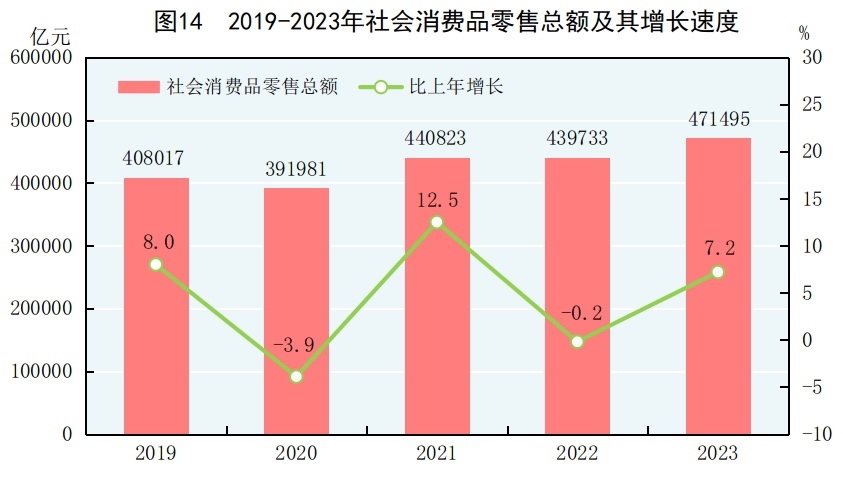 全年社會(huì)消費(fèi)品零售總額471495億元,比上年增長(zhǎng)7.2%。按經(jīng)營(yíng)地分,城鎮(zhèn)消費(fèi)品零售額407490億元,增長(zhǎng)7.1%;鄉(xiāng)村消費(fèi)品零售額64005億元,增長(zhǎng)8.0%。按消費(fèi)類(lèi)型分,商品零售額418605億元,增長(zhǎng)5.8%;餐飲收入52890億元,增長(zhǎng)20.4%。服務(wù)零售額[36]比上年增長(zhǎng)20.0%。