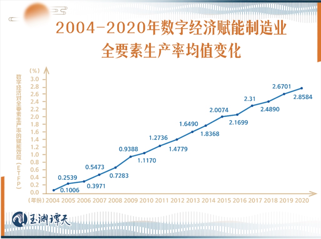 有學者做過測算,從2004年開始到2021年,數(shù)字經(jīng)濟賦能制造業(yè)全要素生產(chǎn)率效能呈逐年上升的趨勢,且近年來,賦能均值達到了最高點。