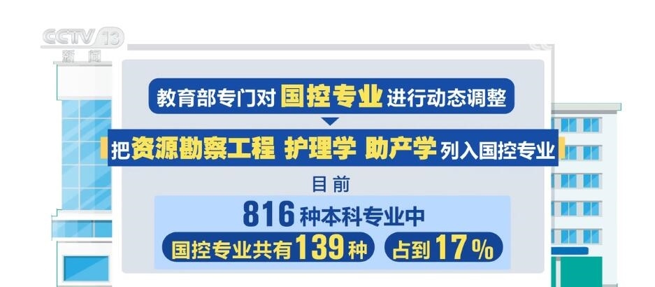 此次教育部專門對國控專業(yè)進(jìn)行了動態(tài)調(diào)整,把資源勘察工程、護(hù)理學(xué)、助產(chǎn)學(xué)列入了國控專業(yè)。目前,816種本科專業(yè)中,國控專業(yè)共有139種,占到17%。未來,國控專業(yè)范圍還將進(jìn)行“有進(jìn)有出”的動態(tài)調(diào)整。
