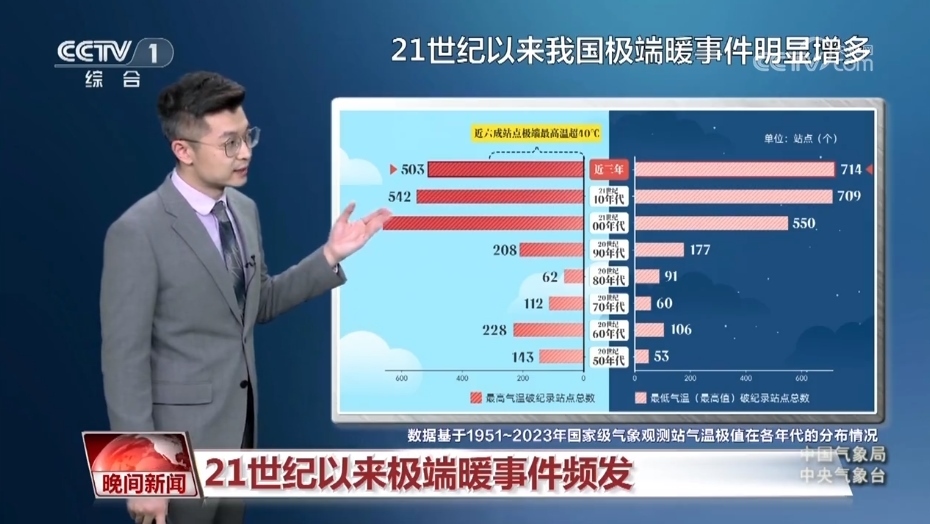 氣象分析師 胡嘯:我們統(tǒng)計(jì)了上世紀(jì)50年代以來氣溫創(chuàng)紀(jì)錄的站點(diǎn),從白天的國家級氣象站創(chuàng)紀(jì)錄站點(diǎn)來看,有百分之七十都出現(xiàn)在21世紀(jì),近三年數(shù)量達(dá)到了503個(gè),在這其中有六成站點(diǎn)的極端最高氣溫都突破了40℃。不僅白天的氣溫高,夜間的氣溫也很高,大致有百分之八十的站點(diǎn)都出現(xiàn)在21世紀(jì)。近三年是達(dá)到了714個(gè),這要比以往任何十年的累加都要多。