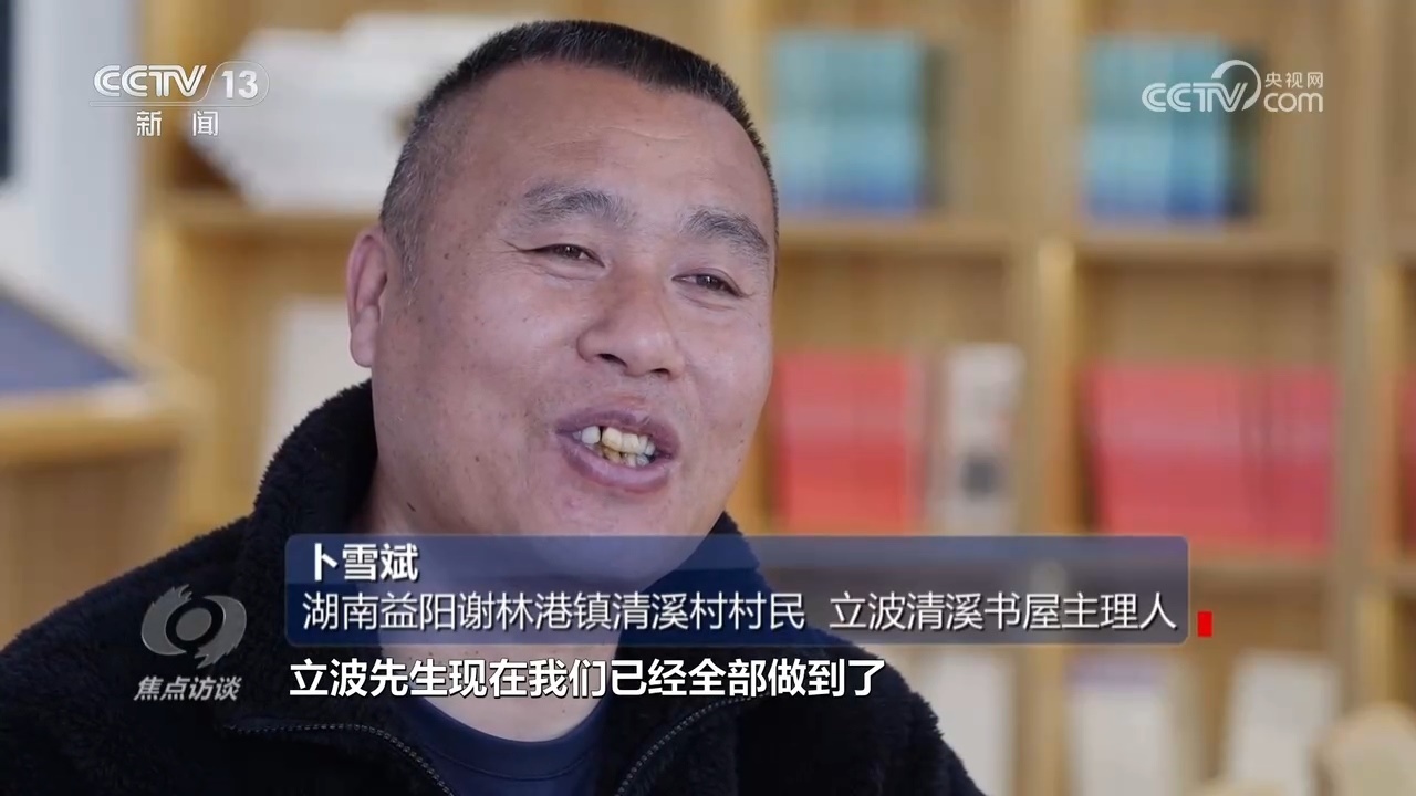 湖南益陽謝林港鎮(zhèn)清溪村村民、立波清溪書屋主理人卜雪斌:“這個時間我記得清清楚楚,村里是2022年3月16日,第一次到我家里來,宣傳書屋的構想,3月19日做設計方案的就過來了,3月22日基本上就動工了?!?/p>