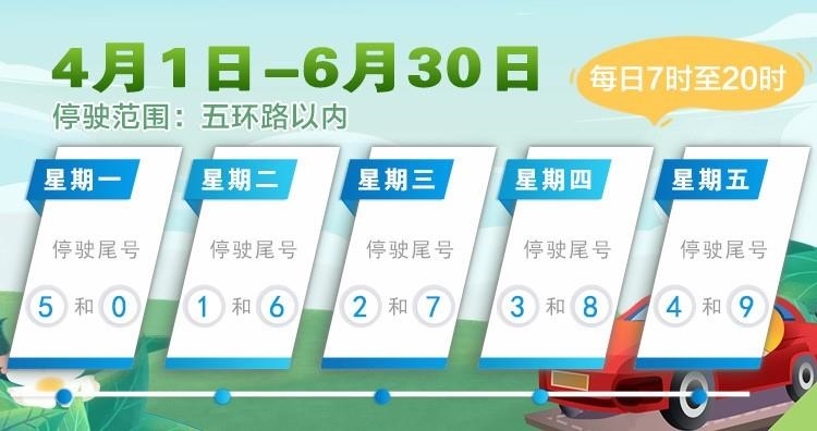從4月1日開始,工作日小客車限行尾號(hào)輪換,周一至周五限行機(jī)動(dòng)車車牌尾號(hào)分別為:5和0、1和6、2和7、3和8、4和9。周五晚高峰適逢尾號(hào)4和9限行,尾號(hào)輪換后通行壓力將尤為突出,出行前請(qǐng)及時(shí)關(guān)注交管部門發(fā)布的實(shí)時(shí)路況信息,盡量錯(cuò)峰出行。