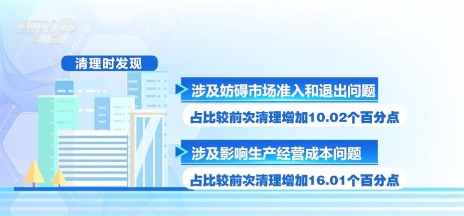 市場(chǎng)監(jiān)管總局表示,本次清理工作雖然取得顯著成效,但在清理時(shí)還發(fā)現(xiàn)涉及妨礙市場(chǎng)準(zhǔn)入和退出、影響生產(chǎn)經(jīng)營(yíng)成本等領(lǐng)域問題占比較前次清理分別增加10.02和16.01個(gè)百分點(diǎn),涉及妨礙商品和要素自由流動(dòng)領(lǐng)域問題仍然較為突出。