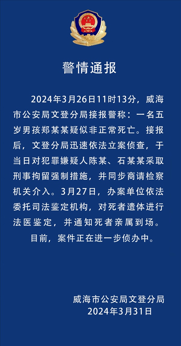 ·山東威海警方通報5歲男童疑被打致死事件:兩名犯罪嫌疑人被刑拘。