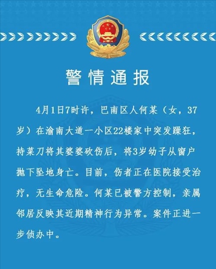 ·重慶一女子砍傷婆婆后將3歲幼子拋下樓致死,已被警方控制。鄰居稱女子高空拋?zhàn)忧岸啻胃呖諕佄?,知情人稱扔小孩母親避開了安全氣囊。